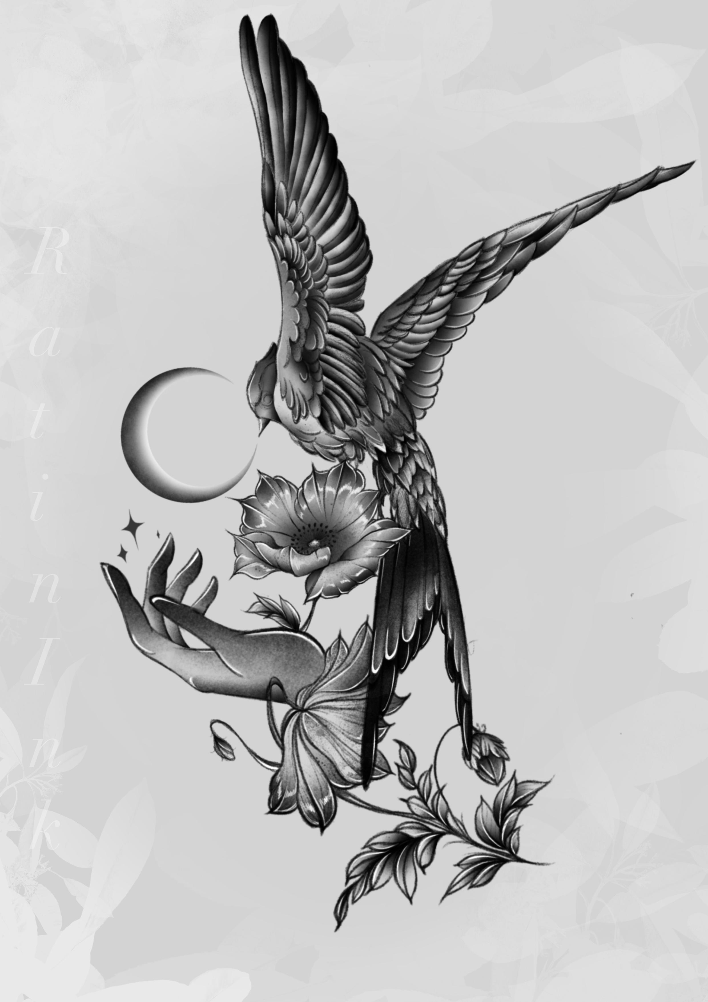 Jaskółka uwięziona #tattoo #tattoos #tattooflash #tattoodo #tattooartist #tattooinspiration #tattooideas #blackwork #graphictattoo #birdtattoo #witchy #swallow #moon #hand #flower #night