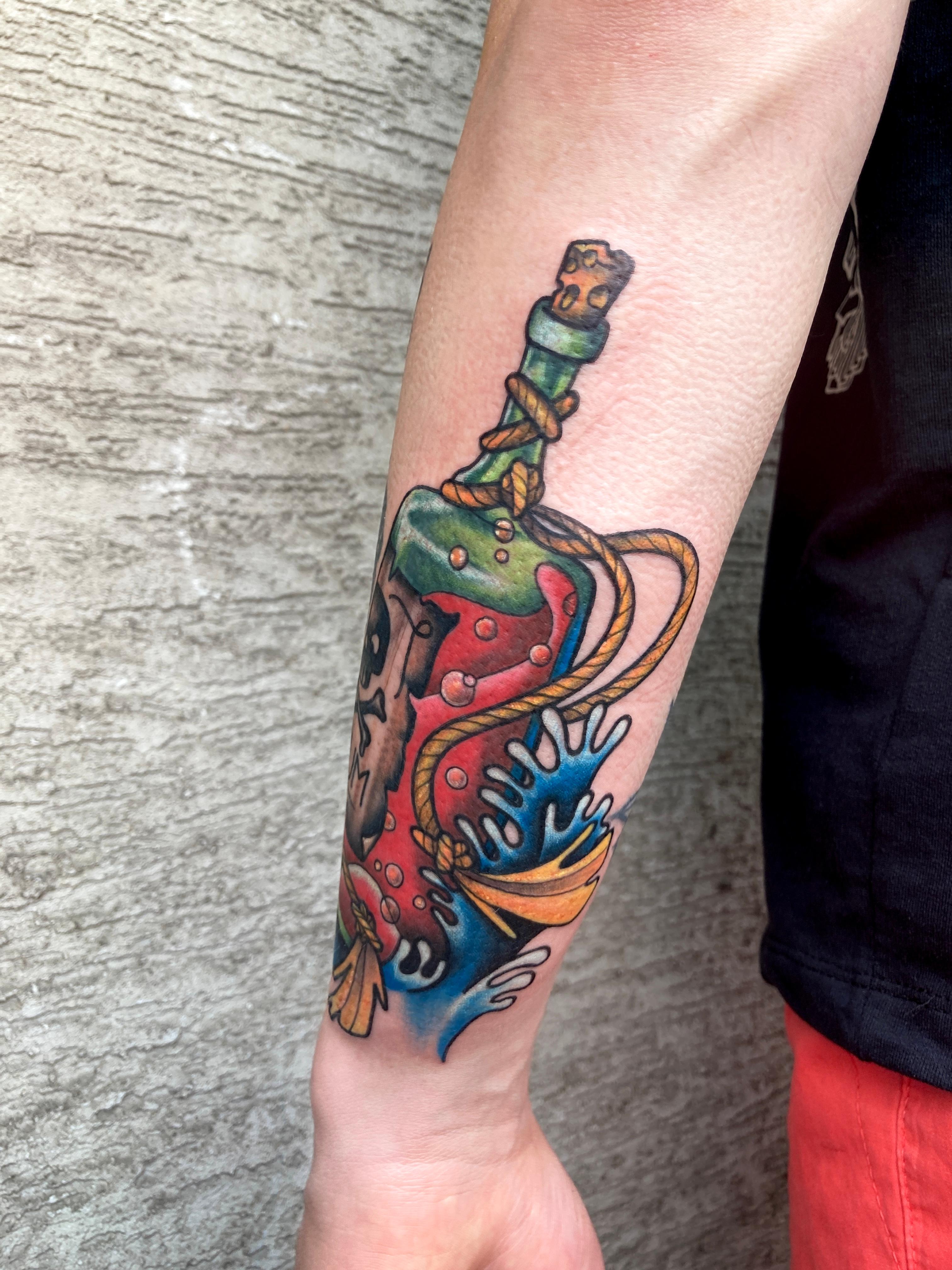 Piracka butelka. Co w środku? Przeklęty rum! #rum #pirat #barman #gastro #alkohol #trucizna #morze #lato #walacje #tradycyjny #przedramie #neotradycyjny #kolrowy #męski #kobiecy